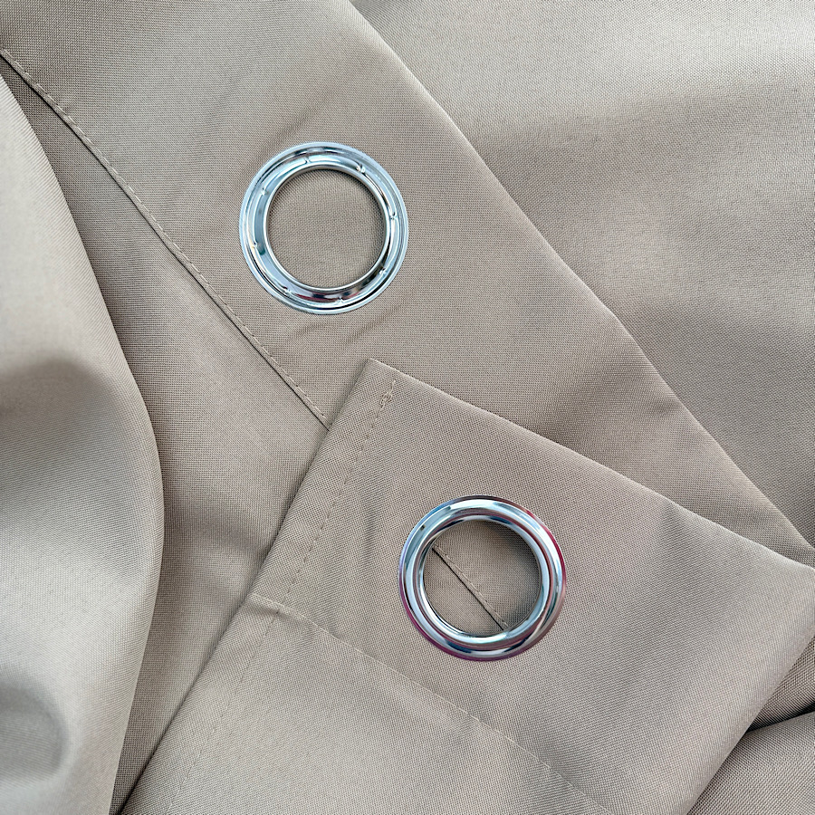 Praktyczne przelotki – srebrne oczka (8 sztuk, średnica 4 cm) umożliwiają szybki montaż na karniszu i sprawiają, że zasłona efektownie się marszczy.