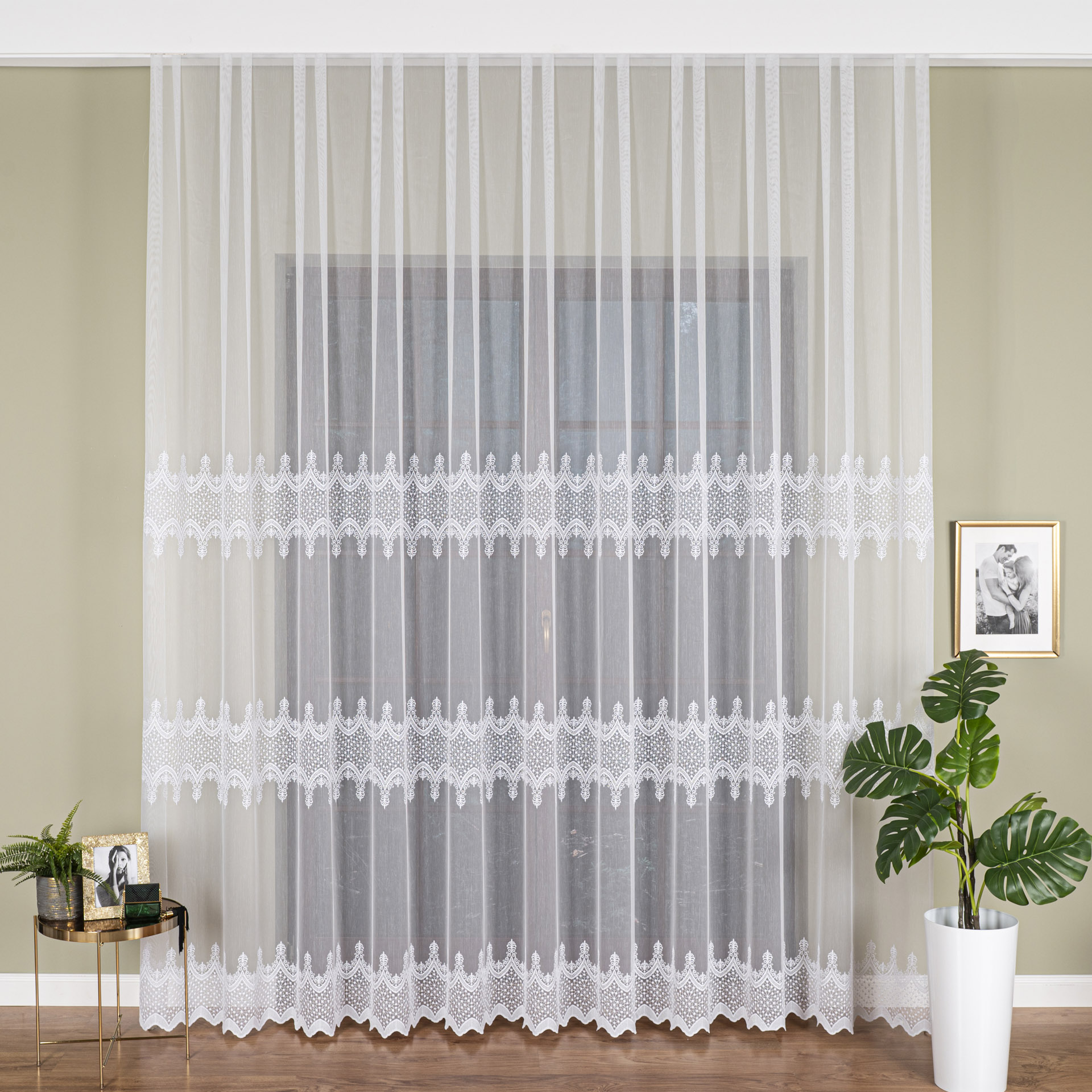 Firana prezentuje się najlepiej przy marszczeniu 1:2 (szerokość karnisza x2).
