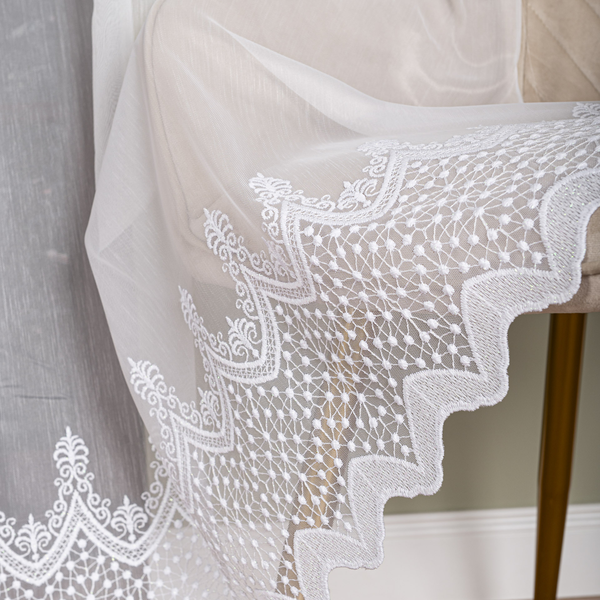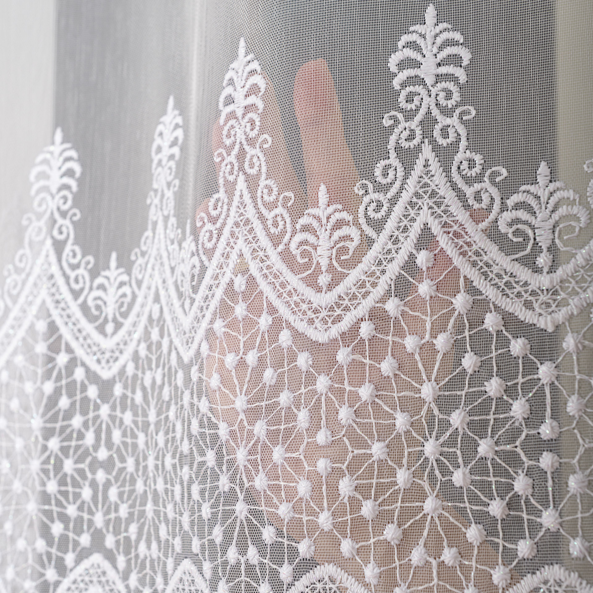 Firana ALAYA to propozycja dla osób, które cenią połączenie subtelności z nowoczesnym akcentem. Delikatna markizeta w kolorze śnieżnej bieli została wzbogacona oryginalnym wzorem haftów umieszczonym po całości firany, co nadaje jej wyjątkowego charakteru. To dekoracja okienna, która przyciąga wzrok, a jednocześnie pozostaje elegancka i ponadczasowa.