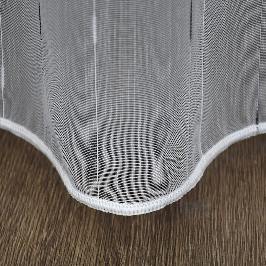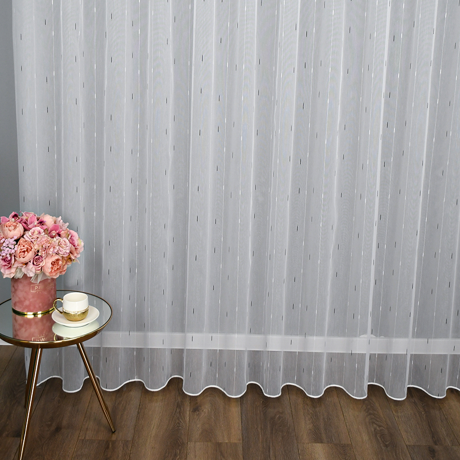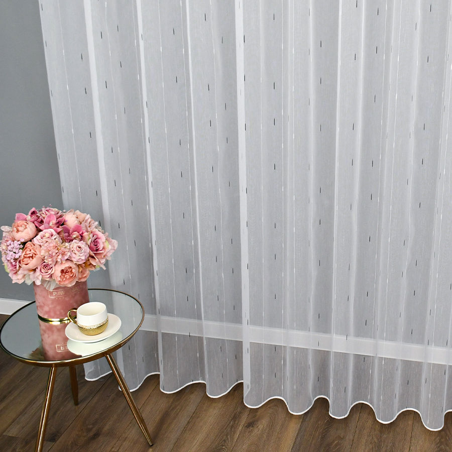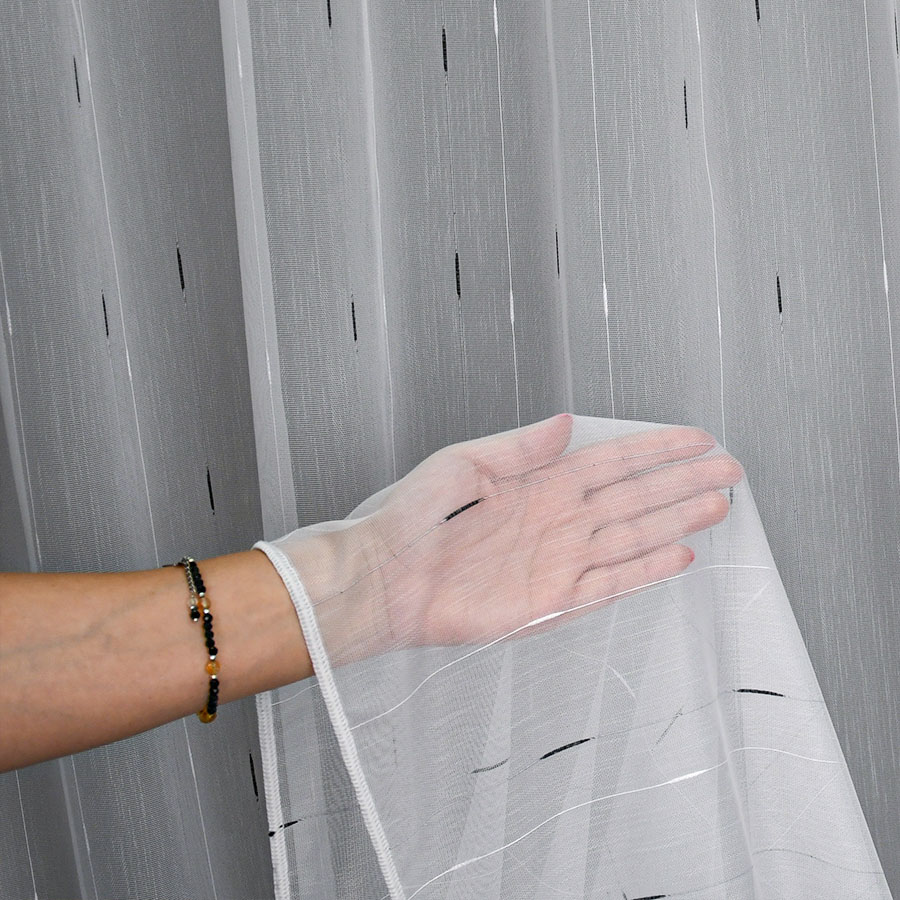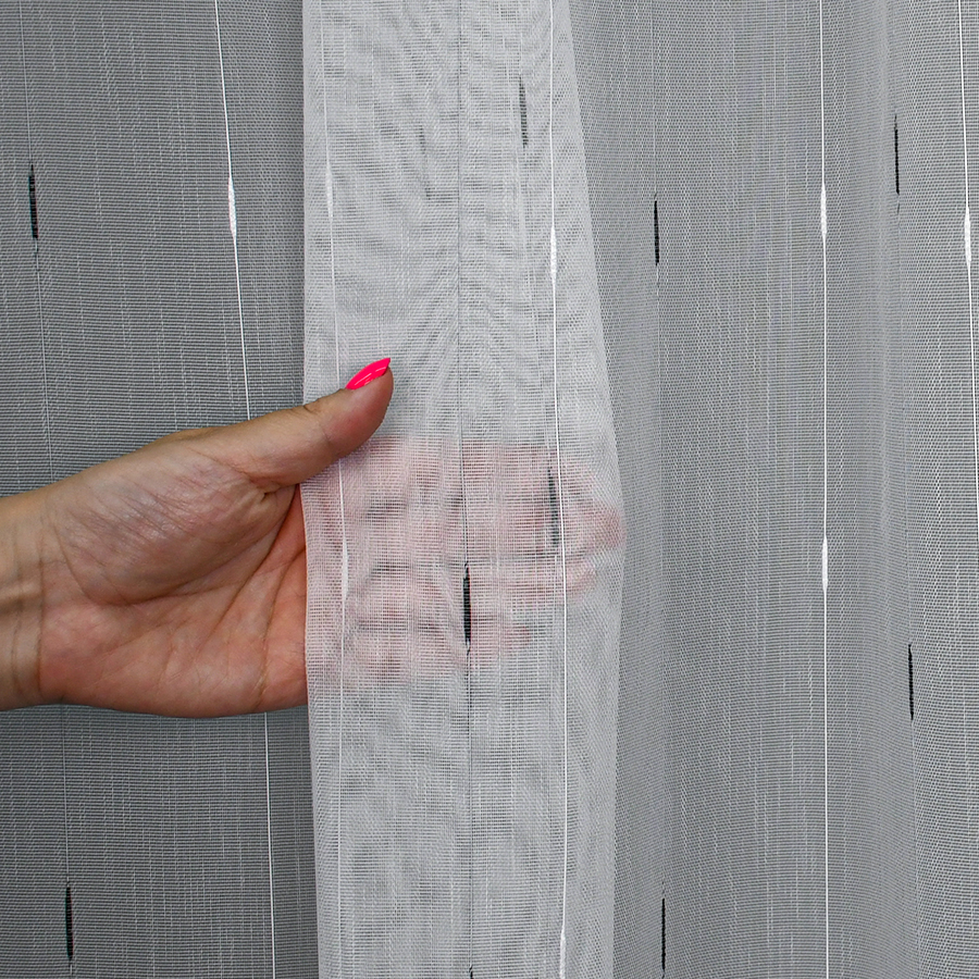 Firana Arona to połączenie przejrzystości markizety strukturalnej i kontrastowego, regularnego wzoru w odcieniach czerni i bieli. Wzór przypomina delikatny deszczyk, który nadaje całości subtelnej dynamiki i nowoczesnej lekkości. Dzięki temu tkanina idealnie wpisuje się zarówno w przestrzenie nowoczesne, jak i bardziej klasyczne.