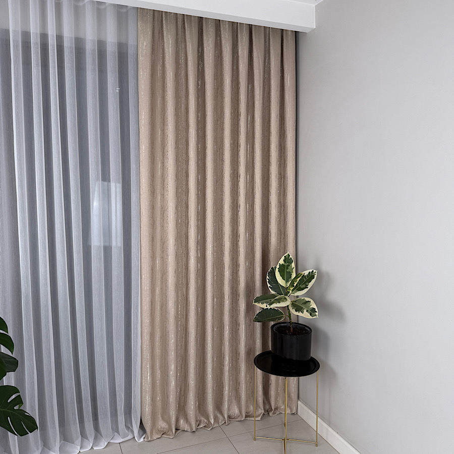 - Przyjemna w dotyku tkanina – miękka struktura sprawia, że zasłona wygląda elegancko i układa się naturalnie, tworząc efekt delikatnej falistości.