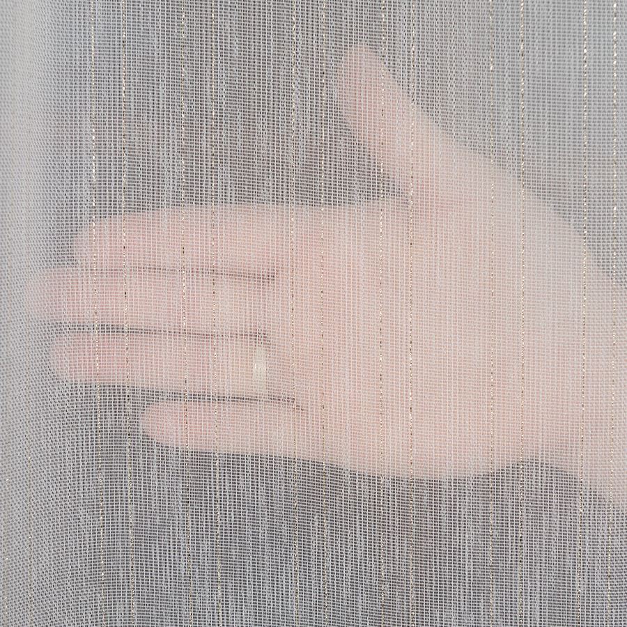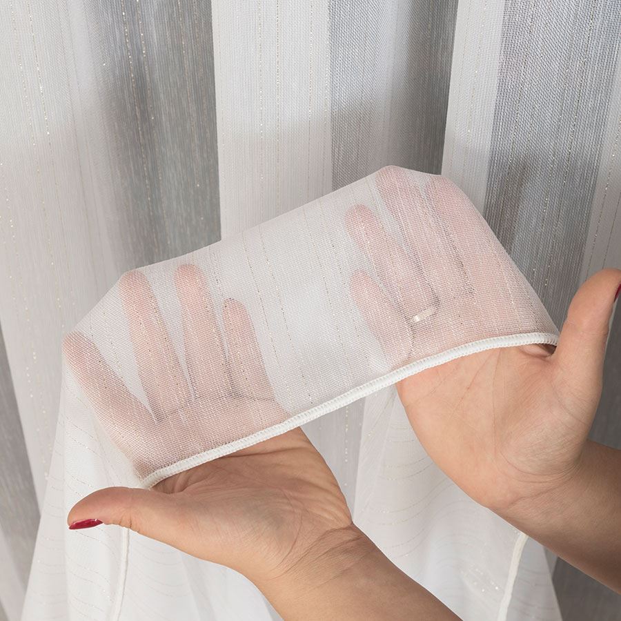 Firana Bonnie w kolorze biało-złotym to wyjątkowa dekoracja okienna, która łączy subtelną elegancję z nowoczesnym błyskiem. Drobna siatka stanowi podstawę struktury firany, którą wzbogacono złotą, połyskującą nitką, co sprawia, że tkanina delikatnie mieni się w świetle, dodając wnętrzu luksusowego charakteru.