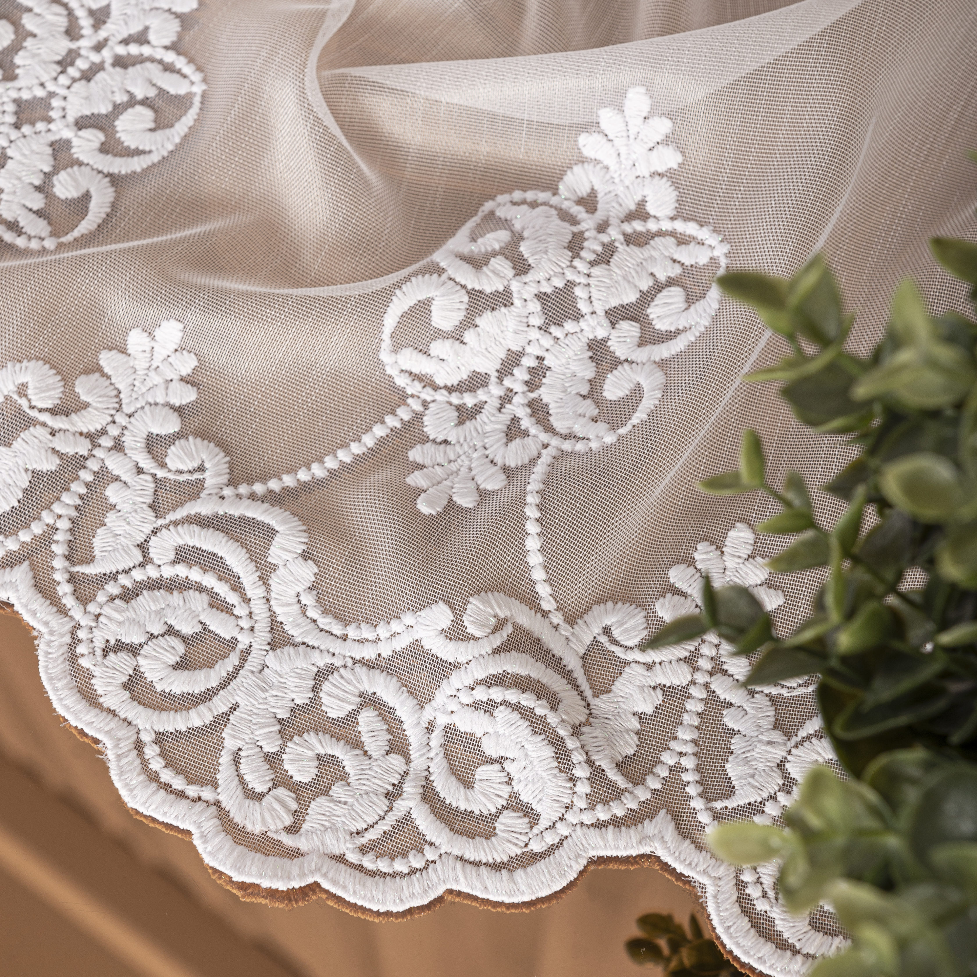 Subtelny haft z połyskującą przędzą nadaje firanie dodatkowego uroku, a co więcej dzięki tej firanie będziesz mógł stworzyć wyjątkową aranżację okienną. Połączenie markizety strukturalnej oraz eleganckiego haftu sprawia, że firana wyróżnia się jakością oraz stylem. Idealnie sprawdzi się do różnego rodzaju wnętrz takich jak kuchni salony a także sypialni.