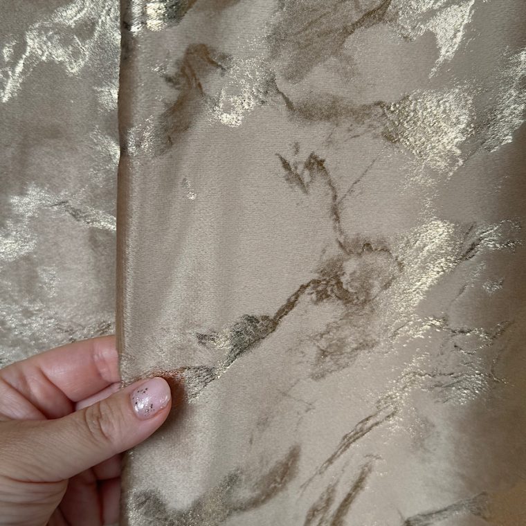 Wprowadź do swojego wnętrza nutę elegancji i luksusu dzięki zasłonie ELENA. Jej wyjątkowy materiał o subtelnym połysku a także marmurkowym wzorze w odcieniach beżu i złota nadaje pomieszczeniu wyrafinowany charakter. Tkanina pięknie układa się w miękkie fale, tworząc efektowną dekorację każdego okna.