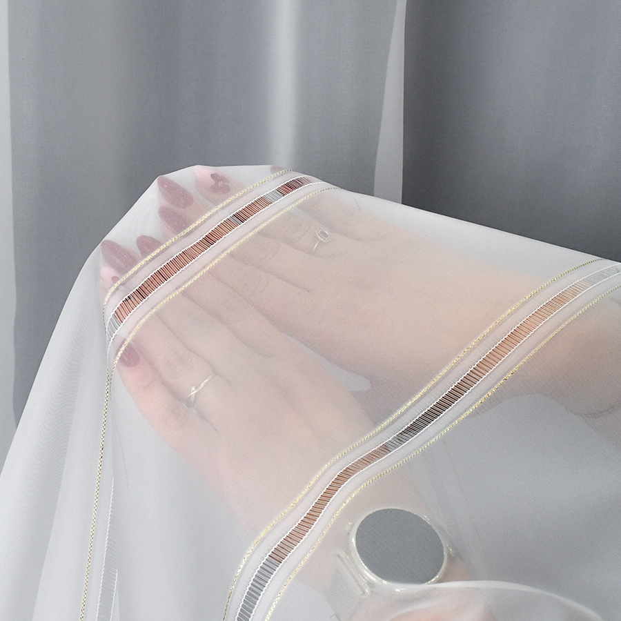 Firana Abella to wyjątkowa propozycja dla osób, które cenią subtelną dekoracyjność połączoną z nutą luksusu. Model wyróżnia się dwoma ozdobnymi pasami ze złotą aplikacją umieszczonymi w dolnej części firany. Delikatny połysk złota pięknie odbija światło, nadając wnętrzu elegancji i wyjątkowego charakteru.