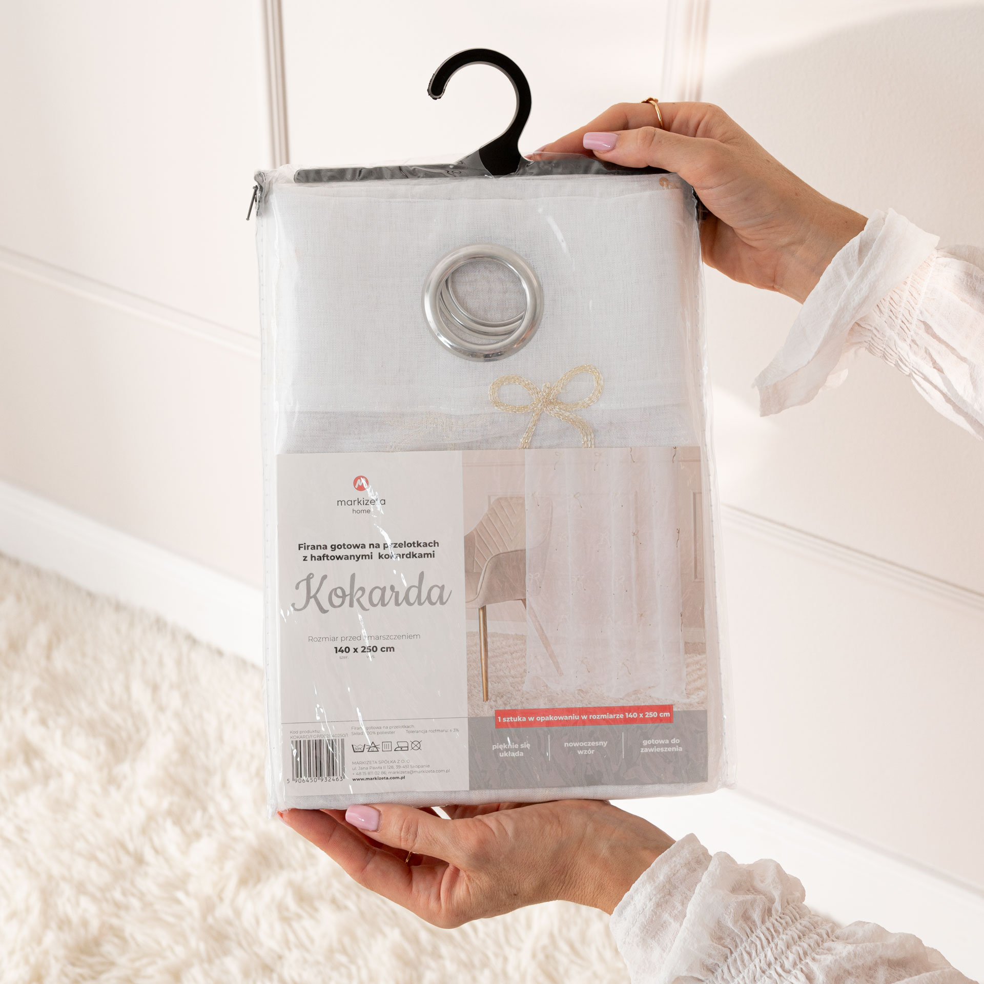 Wymiary firany Amanda wynoszą 140 cm szerokości i 250 cm wysokości, co czyni ją idealnym wyborem do salonu, sypialni, pokoju dziecięcego lub biura. Gładki, pół transparentny materiał subtelnie przepuszcza światło dzienne a wyhaftowane kokardki elegancję tworząc przytulną i jasną atmosferę, jednocześnie zapewniając minimum prywatności. Firana nie przytłacza wnętrz, ale przeciwnie – sprawia, że wydają się większe i lżejsze wizualnie.