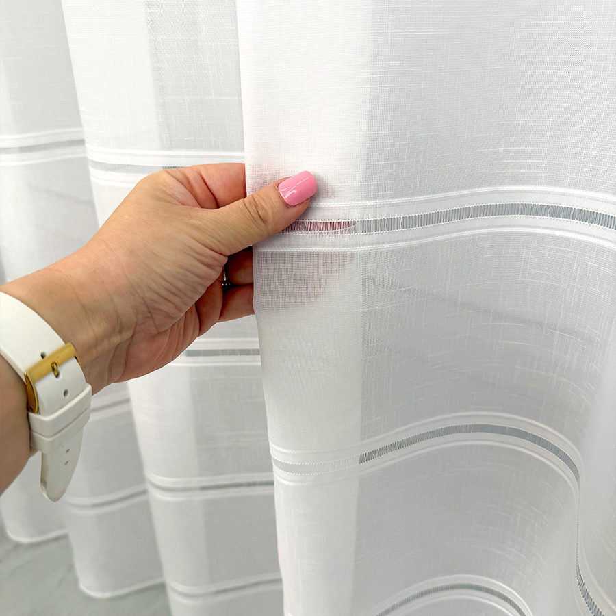 Firana z niezwykle eleganckim i ponadczasowym motywem delikatnych 4 paseczków dołem to propozycja dla miłośników minimalistycznego stylu i wysokiej jakości tkanin. Gładka, jednolita powierzchnia bez żadnych wzorów czy zdobień sprawia, że materiał prezentuje się niezwykle elegancko i czysto. Biały odcień subtelnie rozprasza światło dlatego też wprowadza do wnętrza miękką poświatę i przytulną atmosferę. Dzięki średniemu poziomowi krycia firana zapewnia prywatność a także nie zaciemnia pomieszczenia.