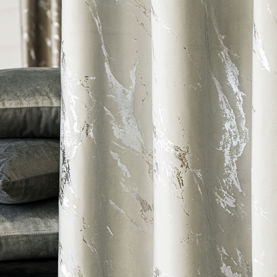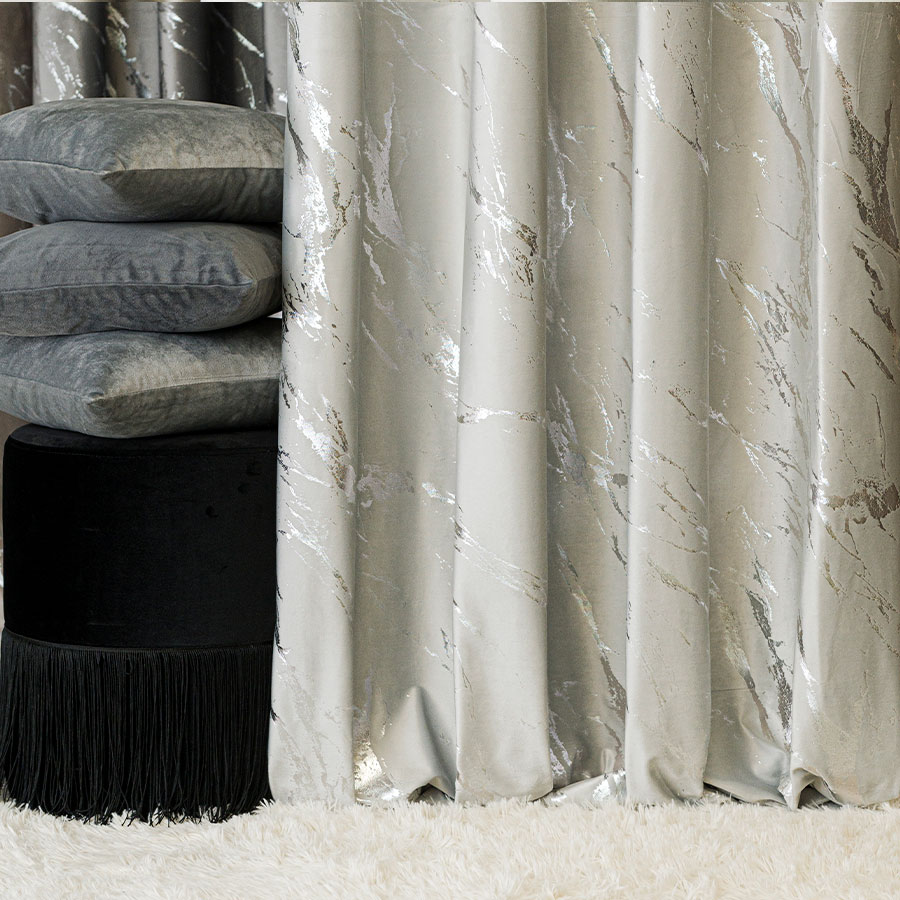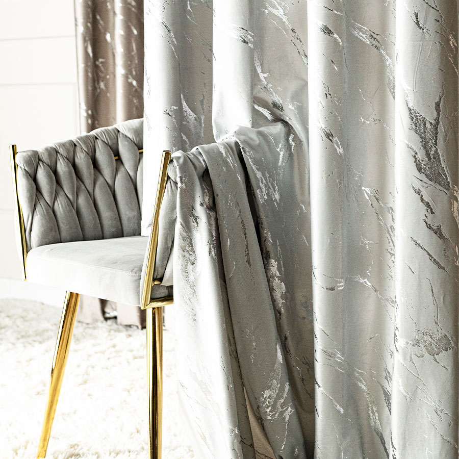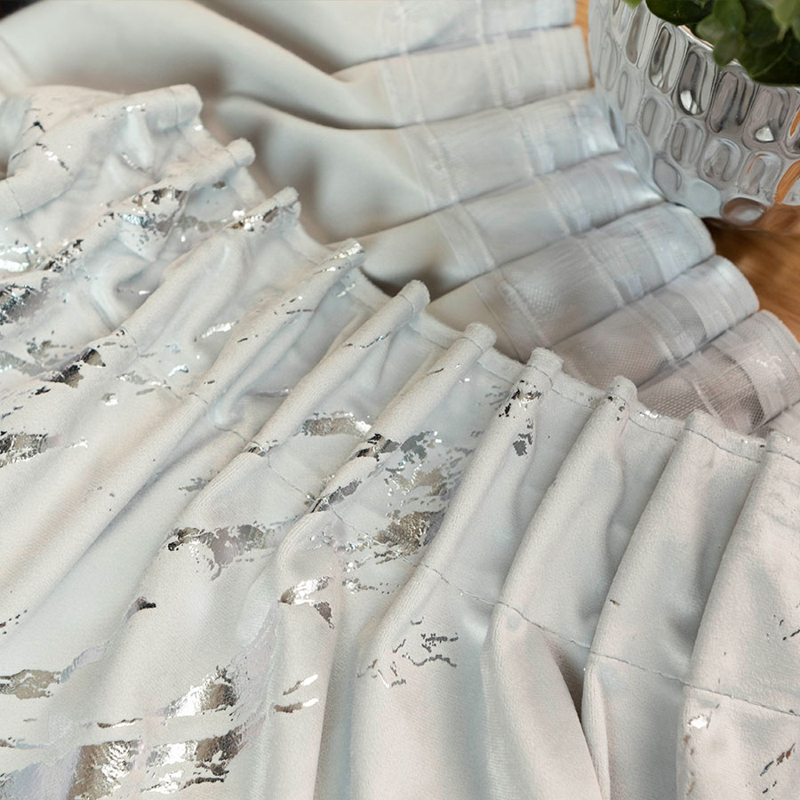 Dodaj wnętrzu elegancji i luksusu dzięki gotowej zasłonie wykonanej z wysokiej jakości welwetu z dekoracyjnym srebrnym wzorem. Mięsisty, aksamitny materiał pięknie się układa, tworząc efektowną oprawę okna, jednocześnie zapewniając prywatność i częściowe zaciemnienie.