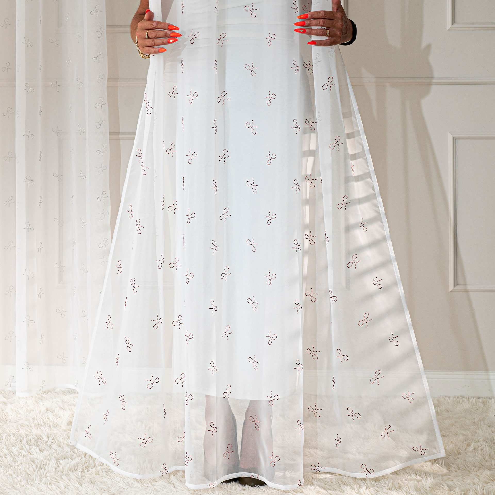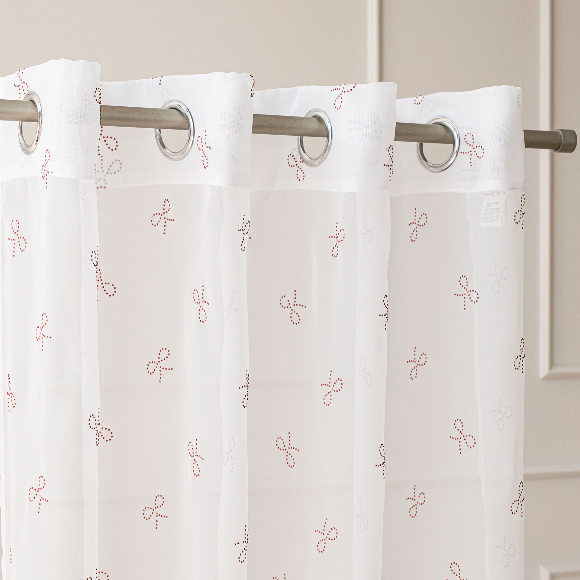 Firana WOALOWA gotowa na przelotkach RIBBON W ROZMIARZE 140×250 cm – kolor biały Z CZERWONYMI KRYSZTAŁOWYMI KOKARDKAMI PO CAŁOŚCI FIRANY