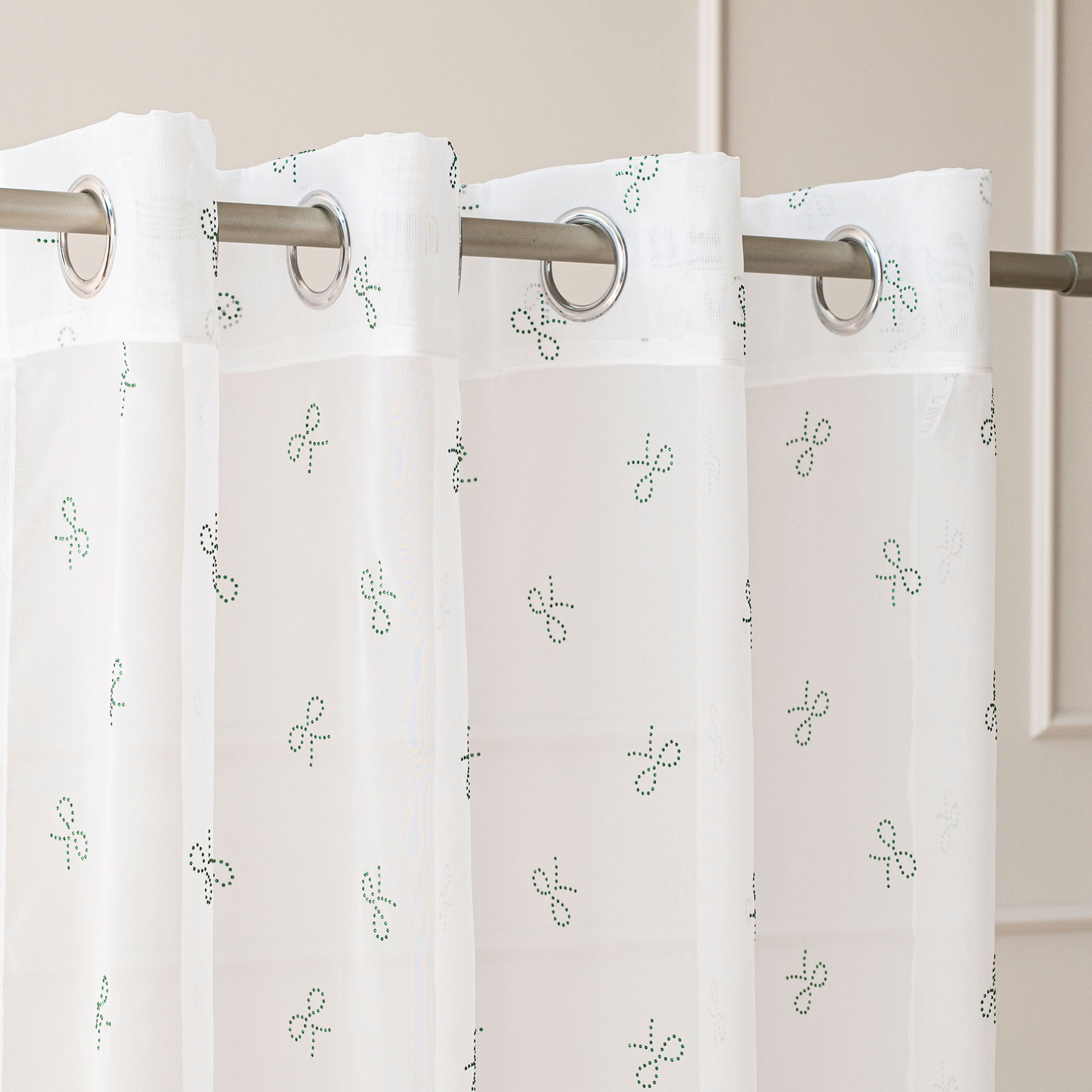 Firana WOALOWA gotowa na przelotkach RIBBON W ROZMIARZE 140×250 cm – kolor biały Z ZIELONYMI KRYSZTAŁOWYMI KOKARDKAMI PO CAŁOŚCI FIRANY